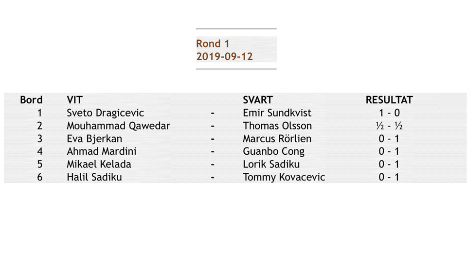 Idag startade EP Open i Svedala och två spelare från Kristineberg SK är med och kämpar i ELO turneringen som är långpartier 90 min/spelare + 30 sek/drag. I skrivande stund har Guanbo Cong startat med en seger med svarta pjäser i första ronden mot Sven-Ingvar Sundin som har ELO 1628. Bra och starkt av Guanbo! Vi väntar spänt på att se hur det går för Felix Nyberg som spelar svart mot Sven Johansson som har ELO 1906. Ni hittar lottning och resultat HÄR Lycka till! Kristineberg SK 16 sep 2019 1kommentar